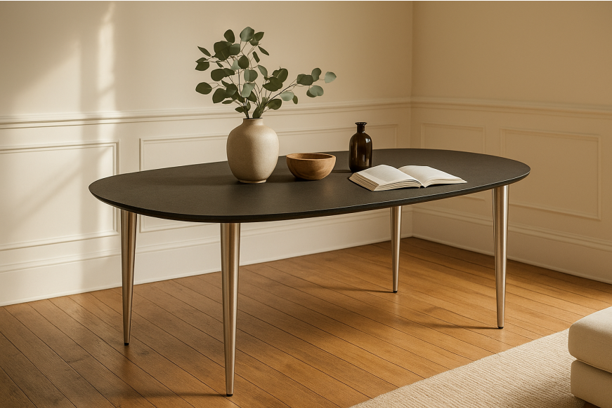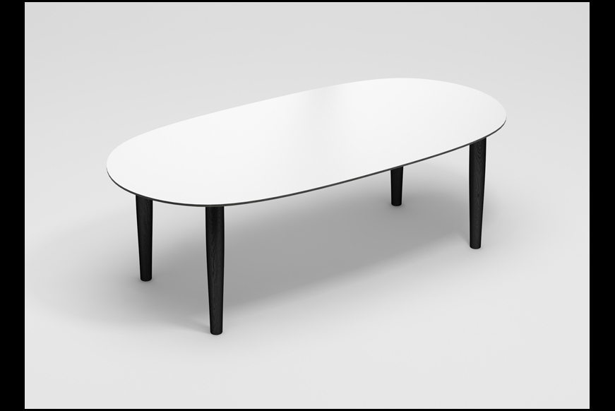 Så skal du vælge om bordpladen skal laves i sort gennemfarvet MDF eller i krydsfiner som er sammenlimet træ, og som giver en flot overgang til træben.