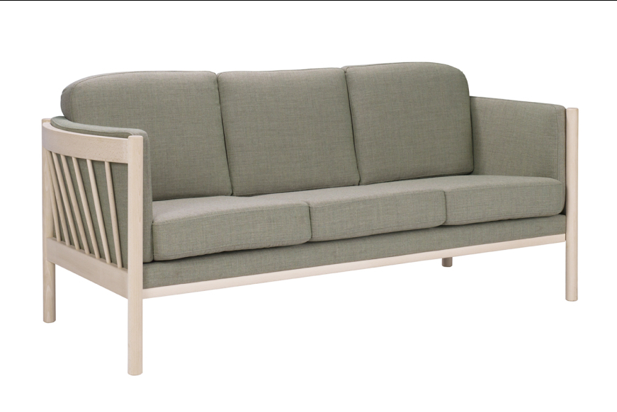 På billedet ses et 2 + 3 prs. Julie sofasæt, samt en Maria stol, med blåt uldbetræk og med ubehandlet bøgetræs stel.