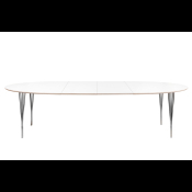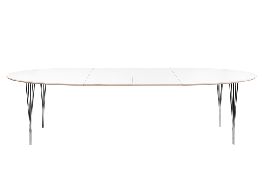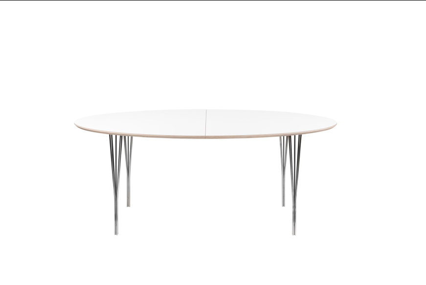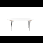 SYMPHONY fra Haslev er et bord med mange muligheder. Flot ovalt formet spisebord med træudtræk. Bordet er vist her i hvid laminat uden kantbehandling og med chrome ben. Der er mulighed for at vælge anden farve under variant. Bordet kan også fås med en sort kantbehandling mod et tillæg, skriv det i kommentarfeltet ved bestilling eller leveres bordet uden kantbehandling.