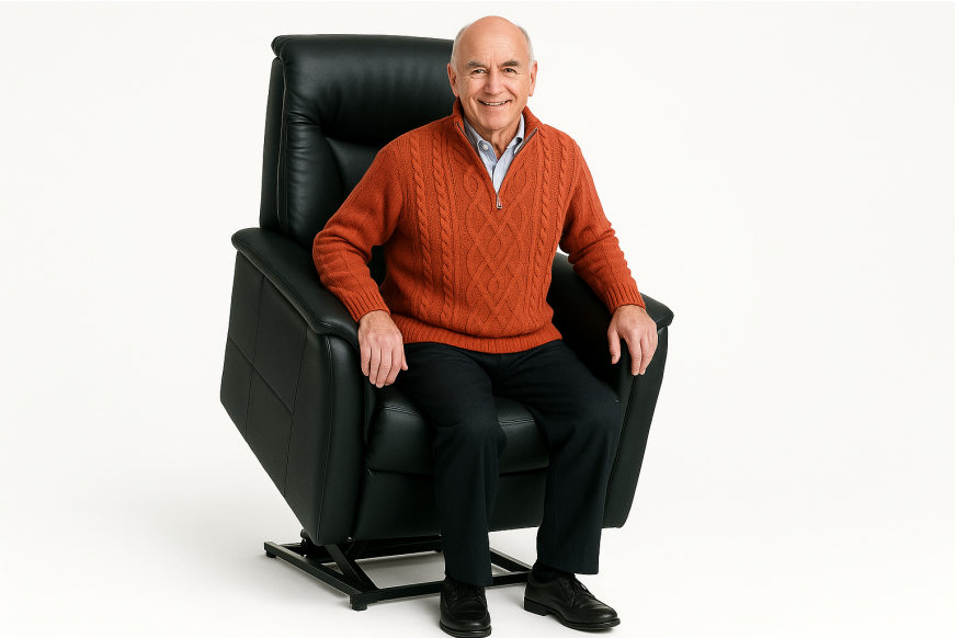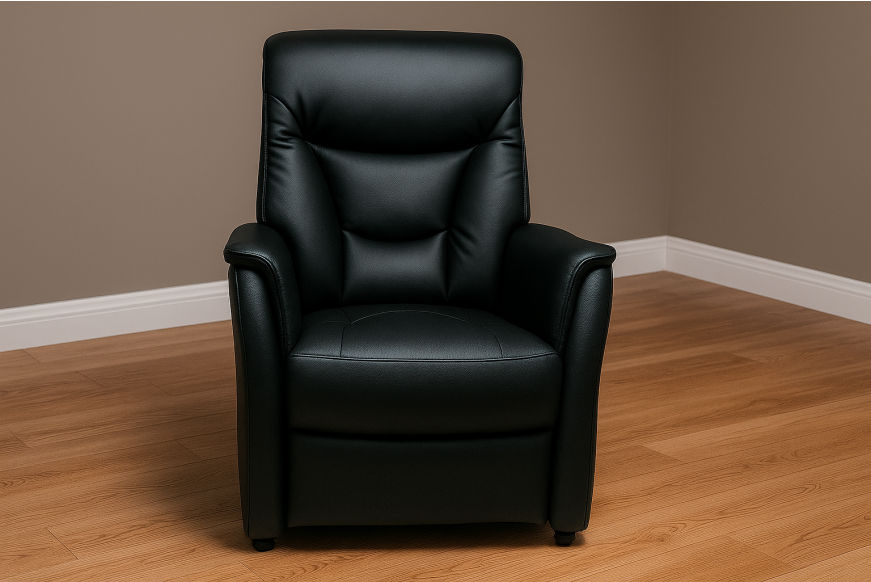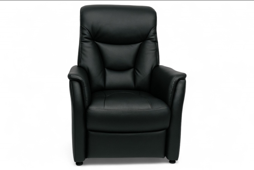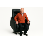 Smart løftestol med super komfort og simpel betjening. Med blødt sort læder som findes i flere farver. Fås også i stof.