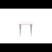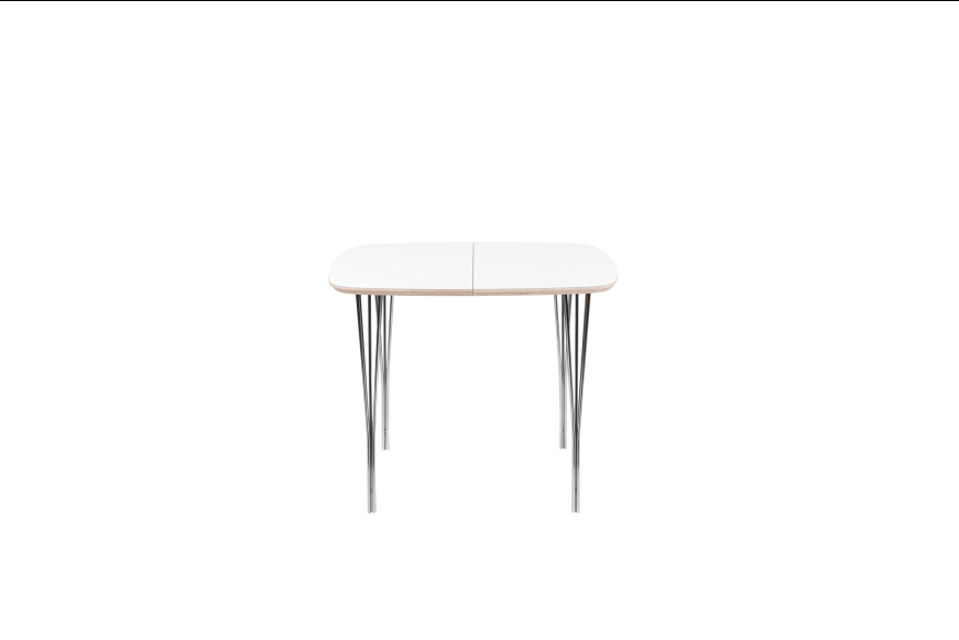 SYMPHONY  fra Haslev er et bord med mange muligheder. Flot rundt spisebord med metaludtræk. Bordet er vist her med hvid laminat topplade og forkromet splitben.
