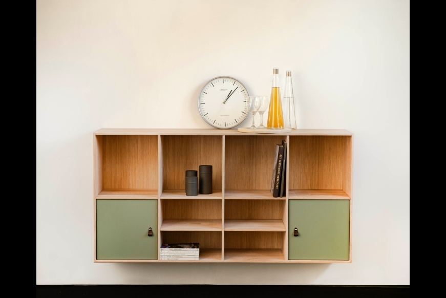 Farver: Naturolieret eg og grågrøn malet MDF