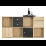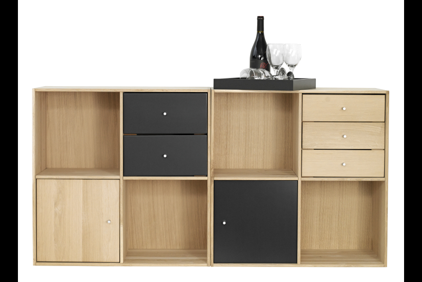 Smuk massiv hvidolieret egetræs reol, med 2 låge og 5 skuffer i egetræ & sort. Med elegante fingertapede hjørner. Fås i et utal af kombinationer.