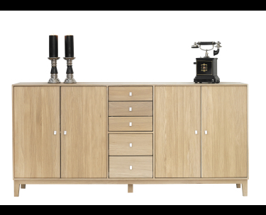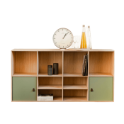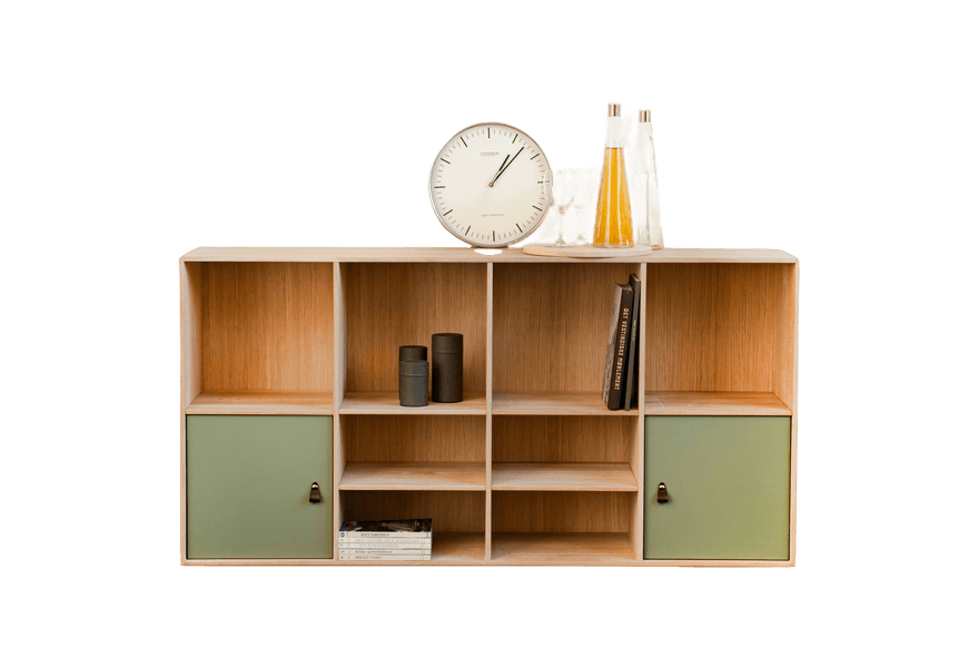Smuk massiv olieret egetræs reol, med 2 grønne låger og masser af åbne rum. Med elegante fingertapede hjørner. Fås i et utal af kombinationer.