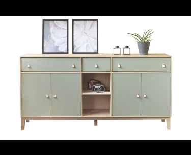 Priseksempel:Info: Smuk massiv olieret egetræs reol, med 2 grønne låger og masser af åbne rum. Med elegante fingertapede hjørner.