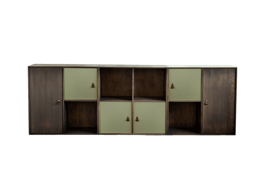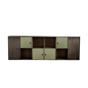 Smuk massiv mørk røget egetræs skænk, med 2 store låger og tilbehør i en flot grågrøn. Med elegante fingertapede hjørner. Fås i et utal af kombinationer.