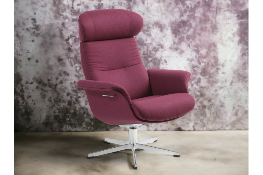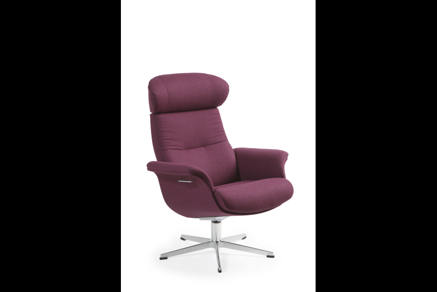 Komfortabel lænestol i uldstof med overtrukne arme, og med swingback funktion. Fås også i stof.