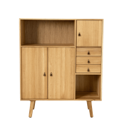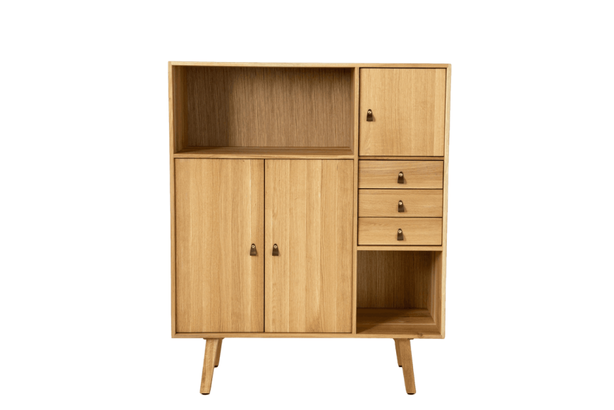 Smuk massiv olieret egetræs highboard med skuffer og låger i egetræ. Med elegante fingertapede hjørner. Fås i et utal af kombinationer.