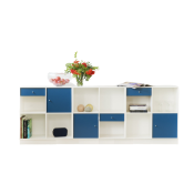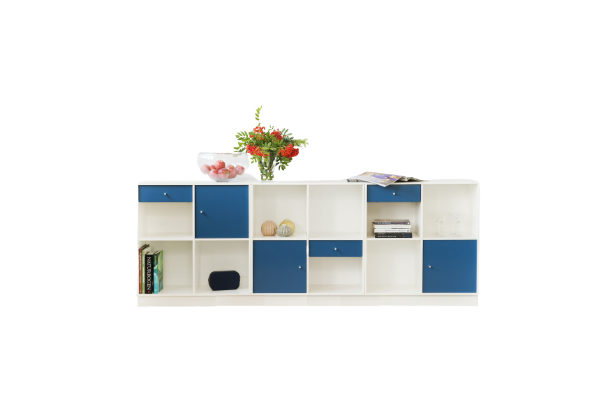 Klassisk og smuk hvid lakeret skænk med blandet tilbehør i blå. Med sokkel. Fås i et utal af kombinationer.
