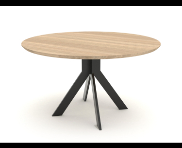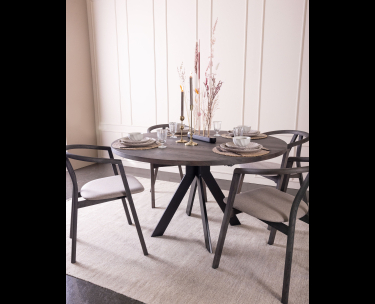 ELEMENTS fra Kristensen & Kristensen er et bord med mange muligheder. Flot rundt spisebord med metaludtræk. Bordet er vist her i massiv oliebehandlet ask med moccafarve.