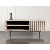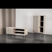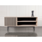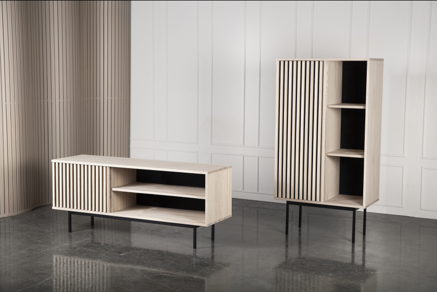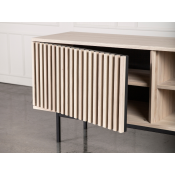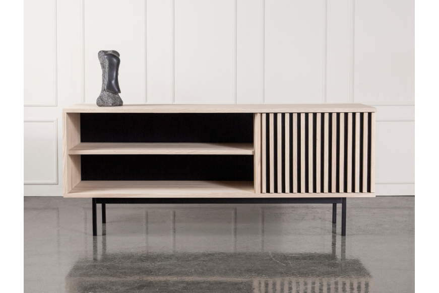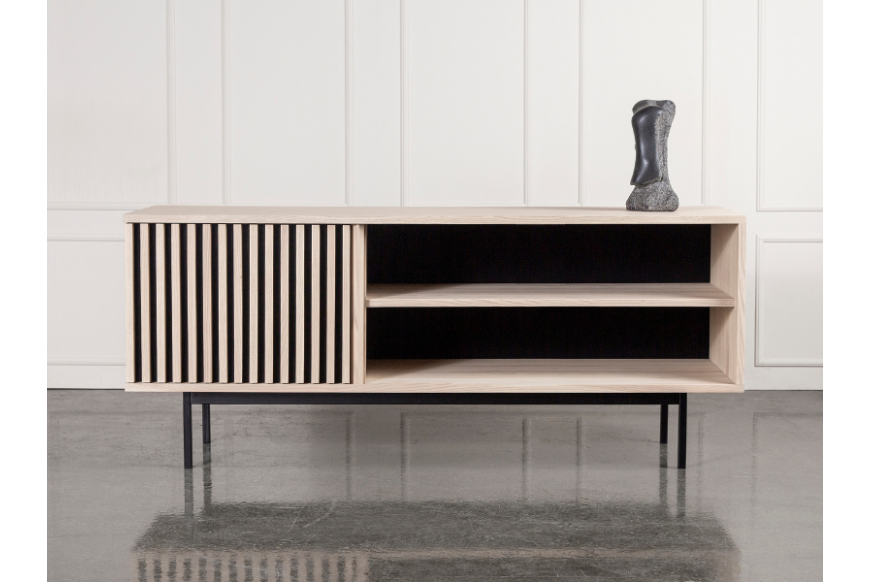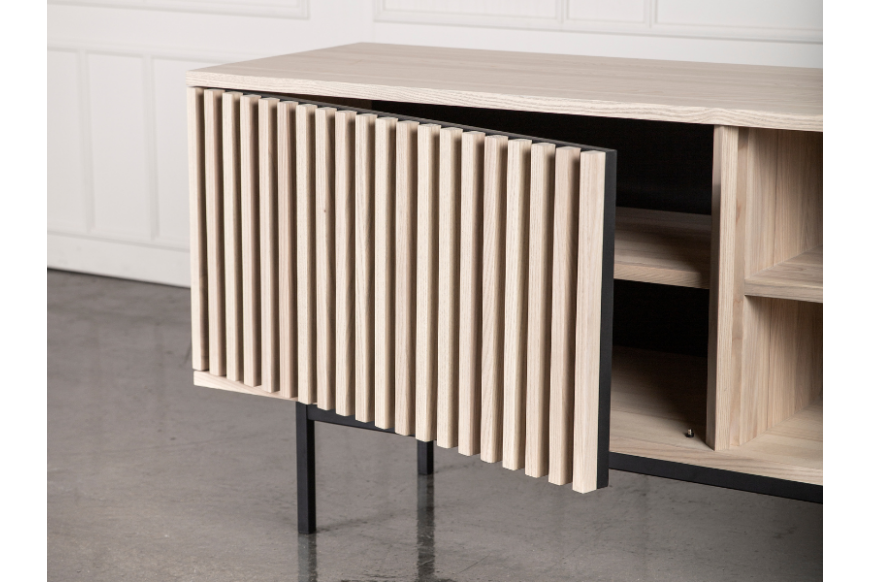 AKUSTIK SKÆNK fra Kristensen & Kristensen er designet med ønske om at forbedre akustikken i boligen samt opretholde et pænt udtryk. Kombinationen af trælameller og filt, er ikke blot tænkt ind i designet for at fornøje øjet, men i lige så høj grad for at absorbere rumklang. Skænken er vist her i massiv hvidolieret ask med sort metal sokkel.