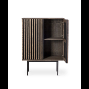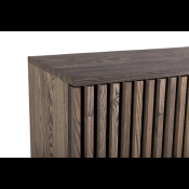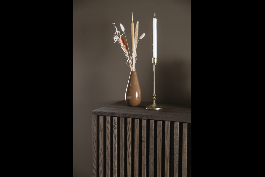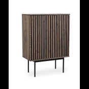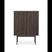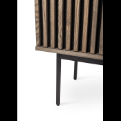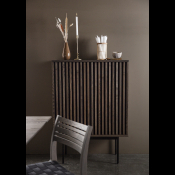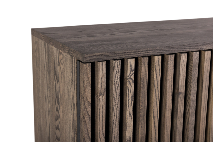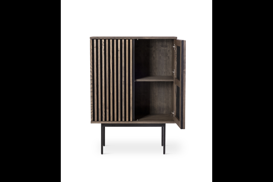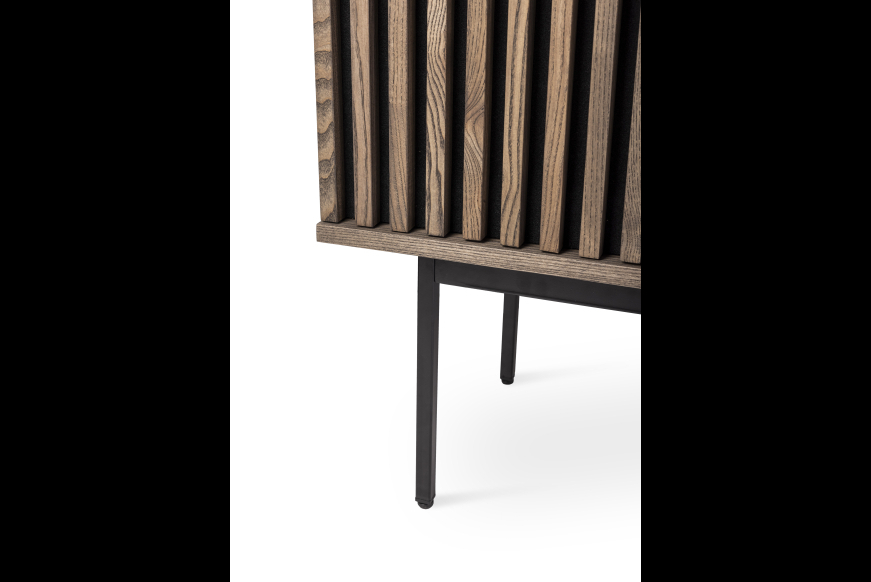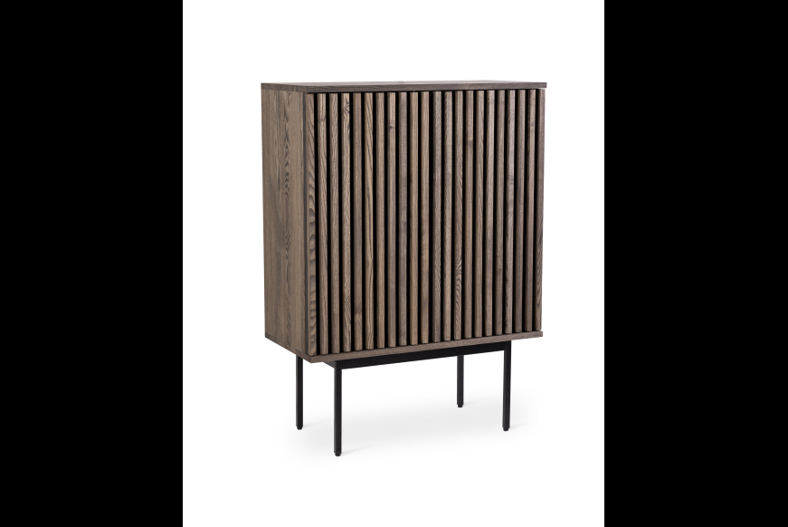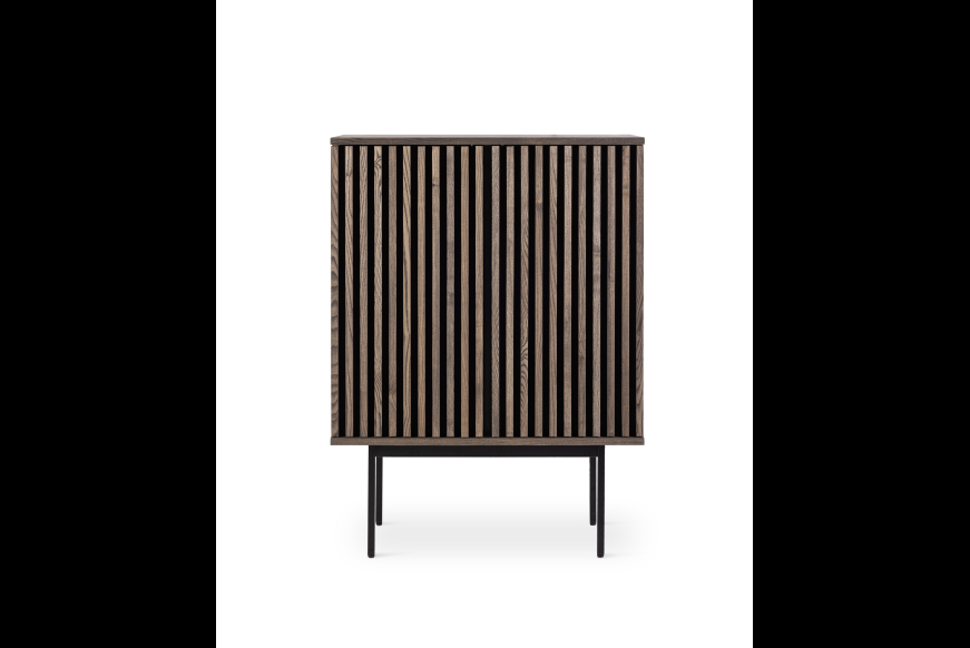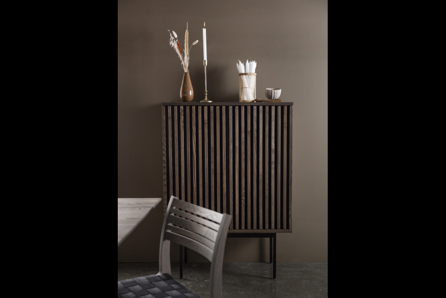 AKUSTIK HIGHBOARD fra Kristensen & Kristensen er designet med ønske om at forbedre akustikken i boligen samt opretholde et pænt udtryk. Kombinationen af trælameller og filt, er ikke blot tænkt ind i designet for at fornøje øjet, men i lige så høj grad for at absorbere rumklang. Highboardet er vist her i massiv mørk grå olieret ask med sort metal sokkel.