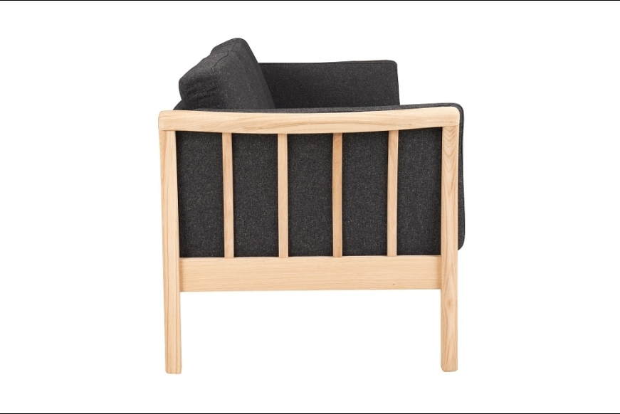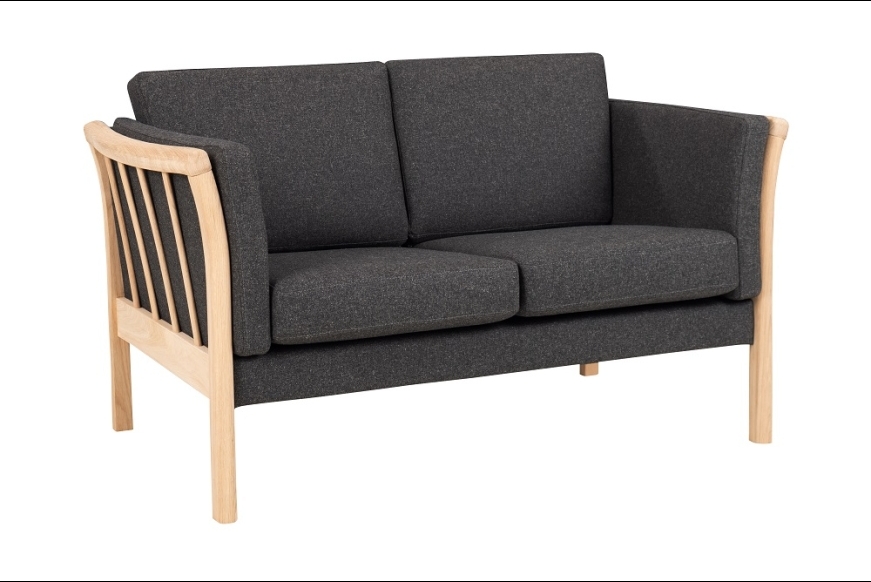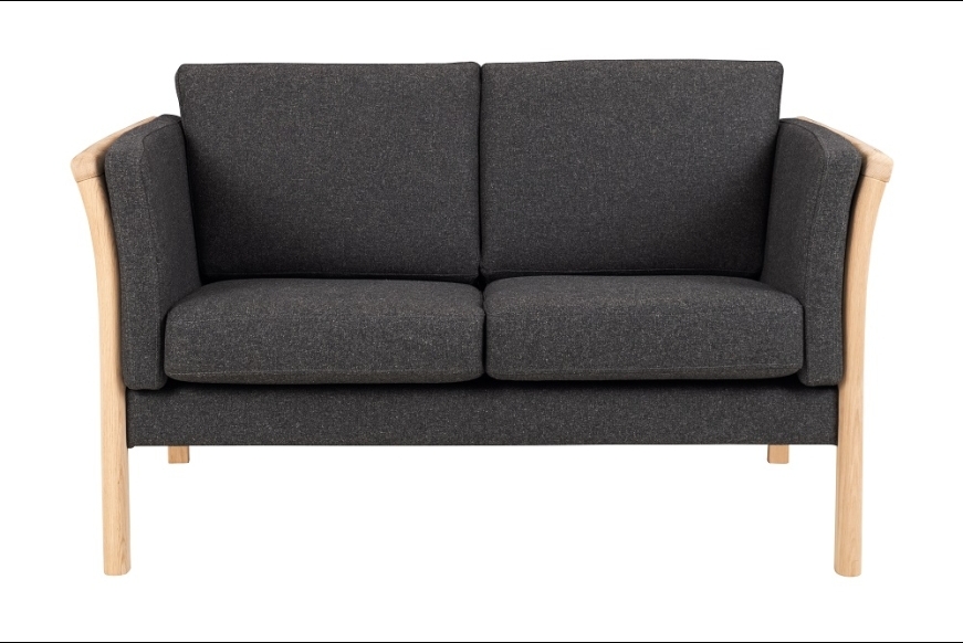 På billedet ses 2 pers. Dorte sofa, med gråt uldbetræk Misha 432-04 og med ubehandlet bøgetræs stel.