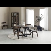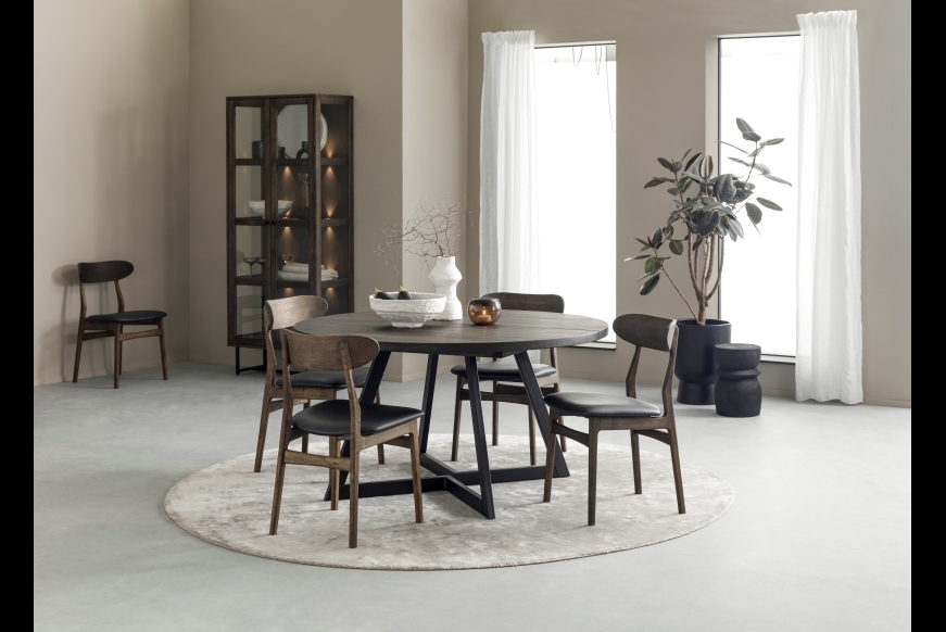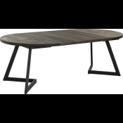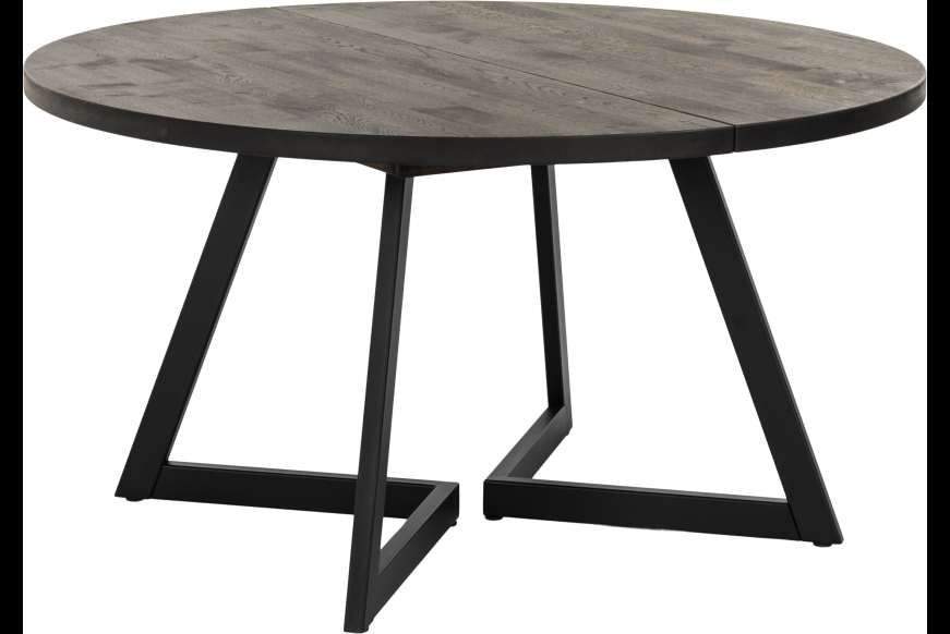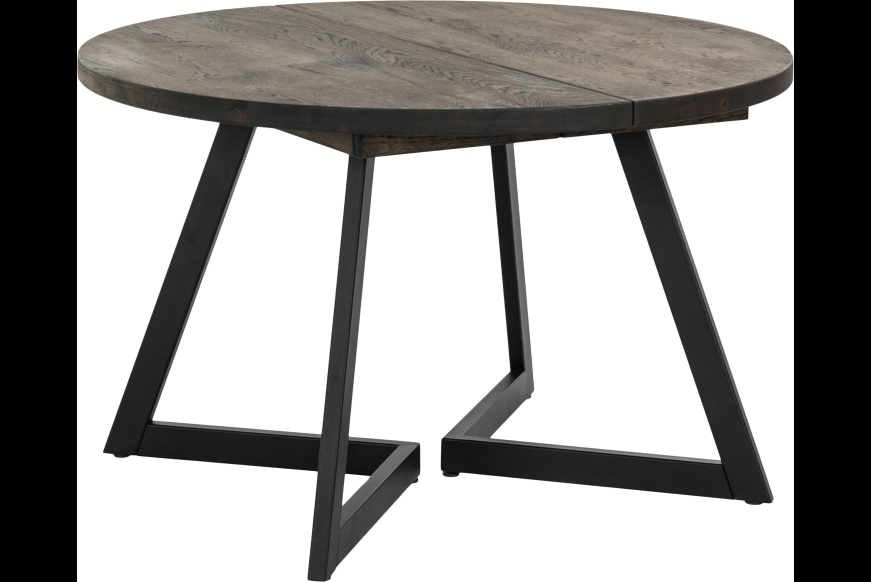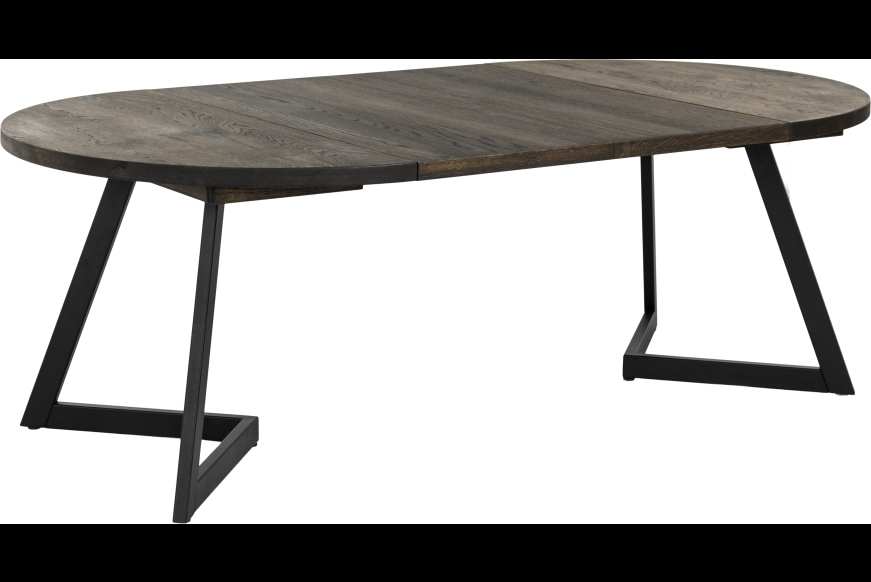 Ambla fra Casø er et flot og elegant rundt plankespisebord med udtræk til 2 tillægsplader. Bordet er vist her i massiv smoked oliebehandlet eg med sort lakeret metal stel
