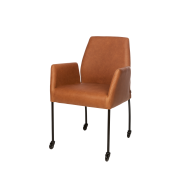 Komfortabel spisebordsstol i cognac læder med sorte metal ben og hjul.