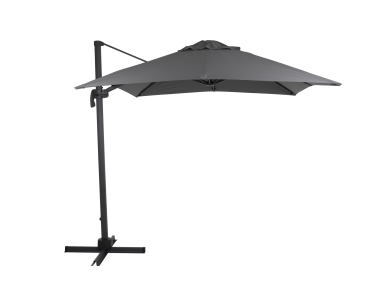 Frithængende parasol. 250 g polyester og aluminium stativ med håndsving og trinløs betjening. Tværben medfølger og skal forankres med parasolfodsvægte eller lignende.