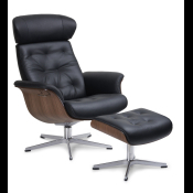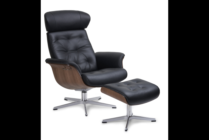 Komfortabel lænestol i semianilin læder og skald i valnød med swingback funktion. Fås også i stof.