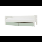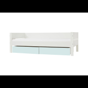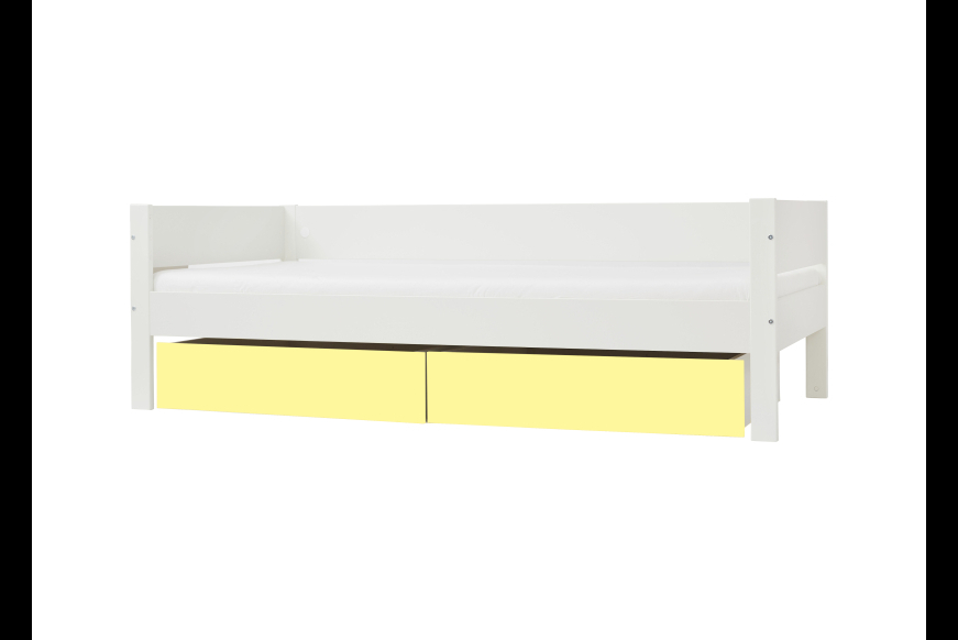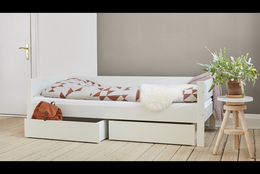 Hvid børneseng med 2 farvede skuffer. Mål: 70 x 160 cm. Fås også i 90 x 200 cm.