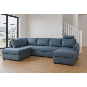 Komfortabel og smart højrevendt U-sovesofa, med simpelt udtræksystem polstret med polyether skum og pocket fjedre i sæde og udtræk, og skum/silikone granulat i ryg puderne. Med indbygget magasin i både open end delen og chaiselong delen.