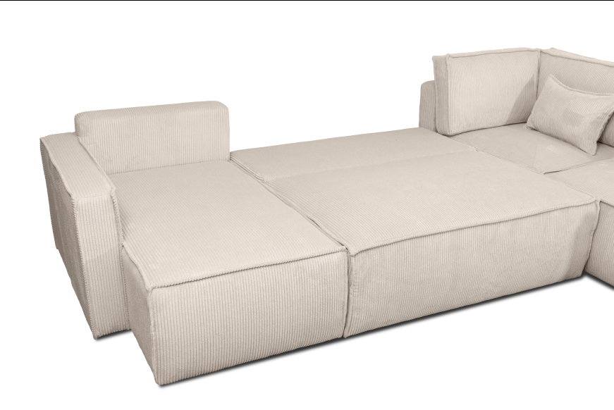 Komfortabel og smart chaiselong sovesofa polstret med polyether skum i sædet og skumgranulat i rygpuderne. Med opbevaring i magasin. Man glemmer helt, at det er en sovesofa, da den er ligesom en almindelig modul sofa.