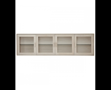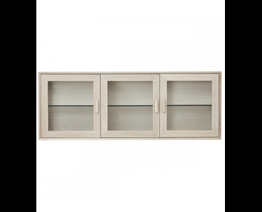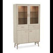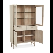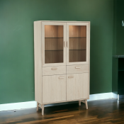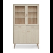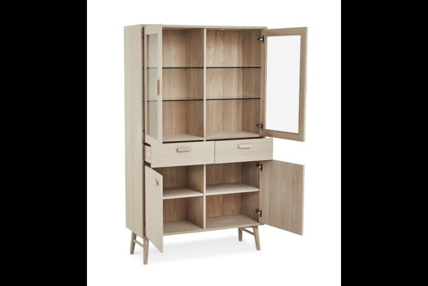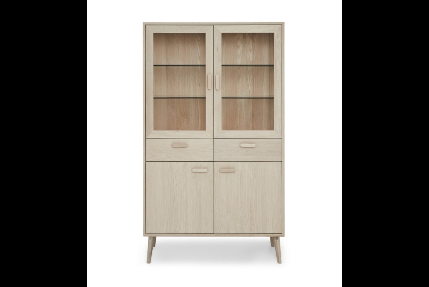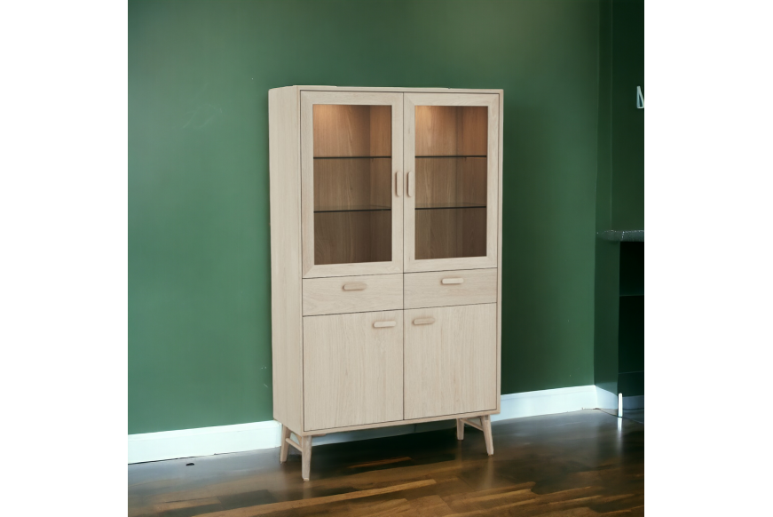 Smuk egetræs vitrine i hvidolieret egetræ. Med kraftige glashylder og LED lys. Med softclose i både låger og skuffer. Fyldt med flotte detaljer.