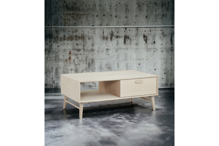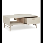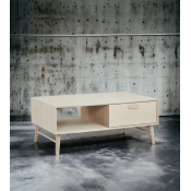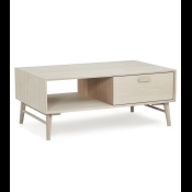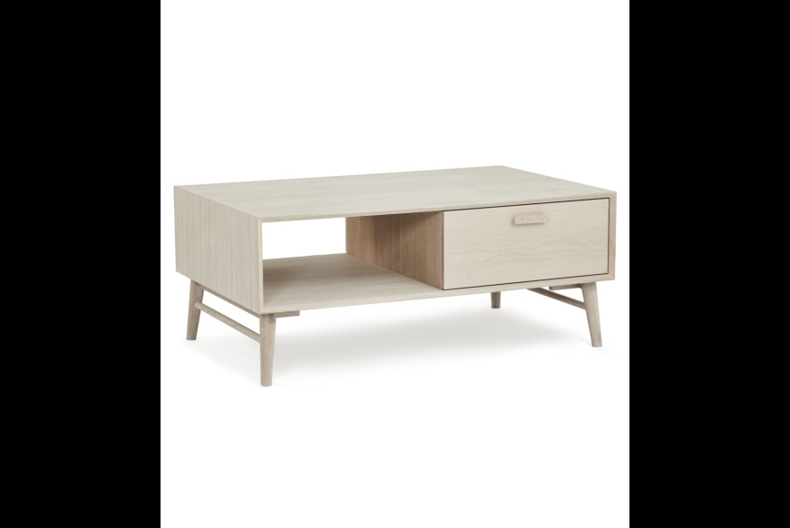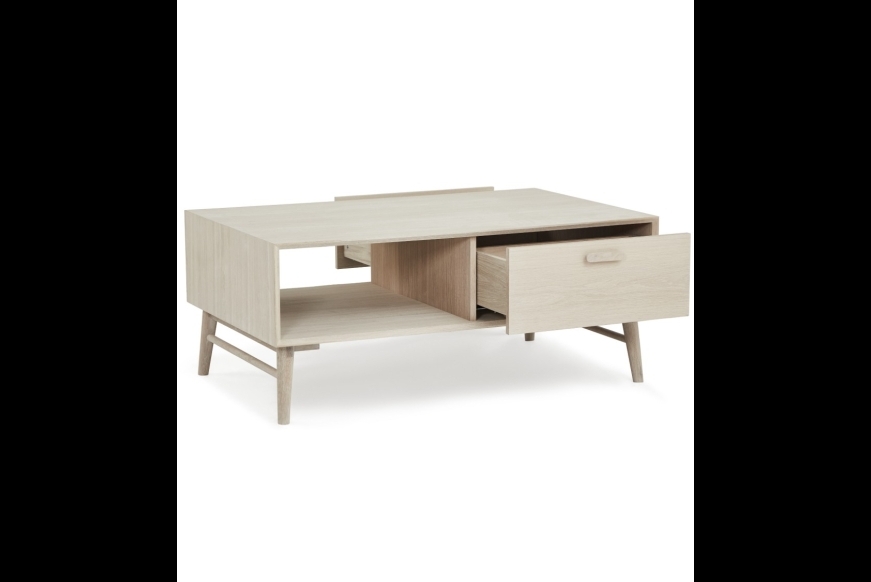 Smukt egetræs sofabord i hvidolieret egetræ. Med 2 skuffer. Med softclose i skuffer og fuldt udtræk. Fyldt med flotte detaljer.