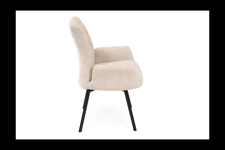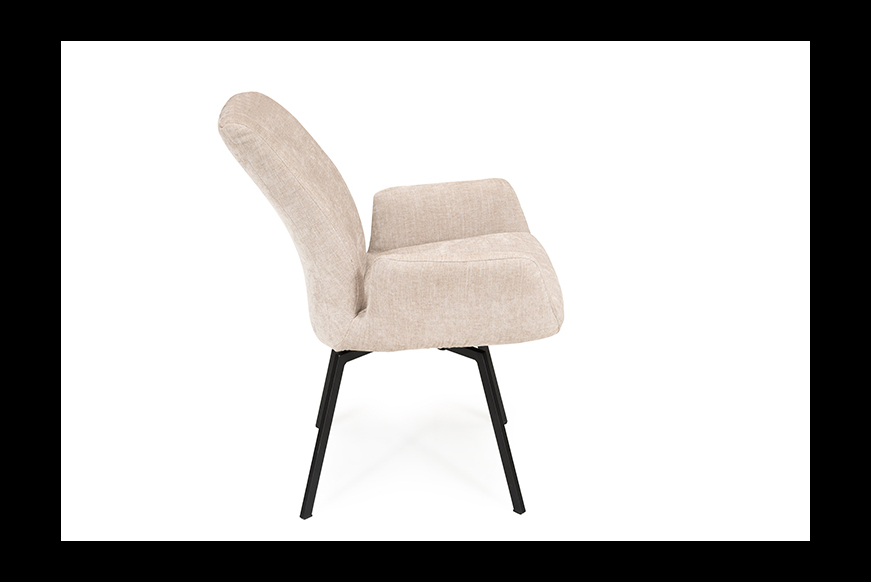 Relax 9053 er en komfortabel spisebordsstol med høj ryg. Stolen er polstret med et stærk stykke stof og har sort stel. Men kan betrækkes med mange forskellige stoffer el. lædere. Ryggen er fleksibel, hvilket giver en ekstra god siddekomfort.