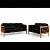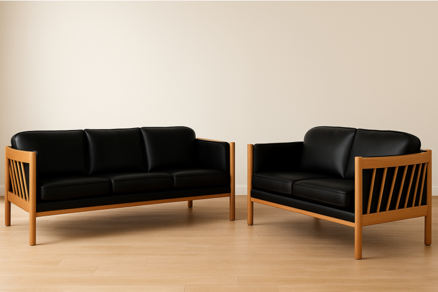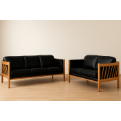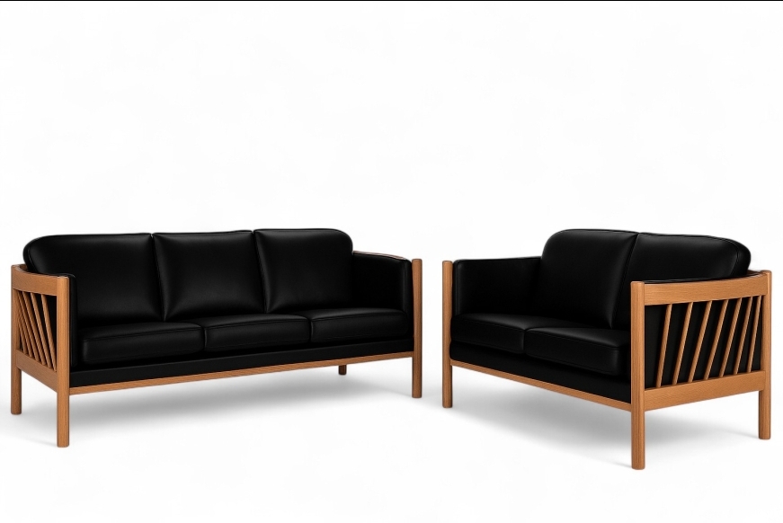 På billedet ses et 3 + 2 prs. Julie sofasæt, med sort læder, massiv eg naturoliebehandlet.