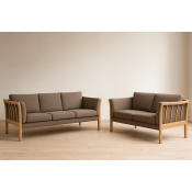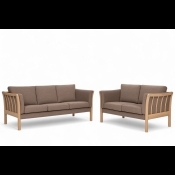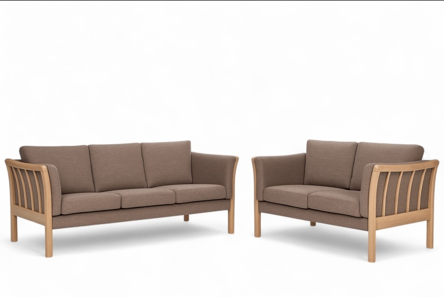 På billedet ses et 3 + 2 prs. Dorte sofasæt, med gråt uldbetræk Misha 432-04 og med bøge lak stel.
