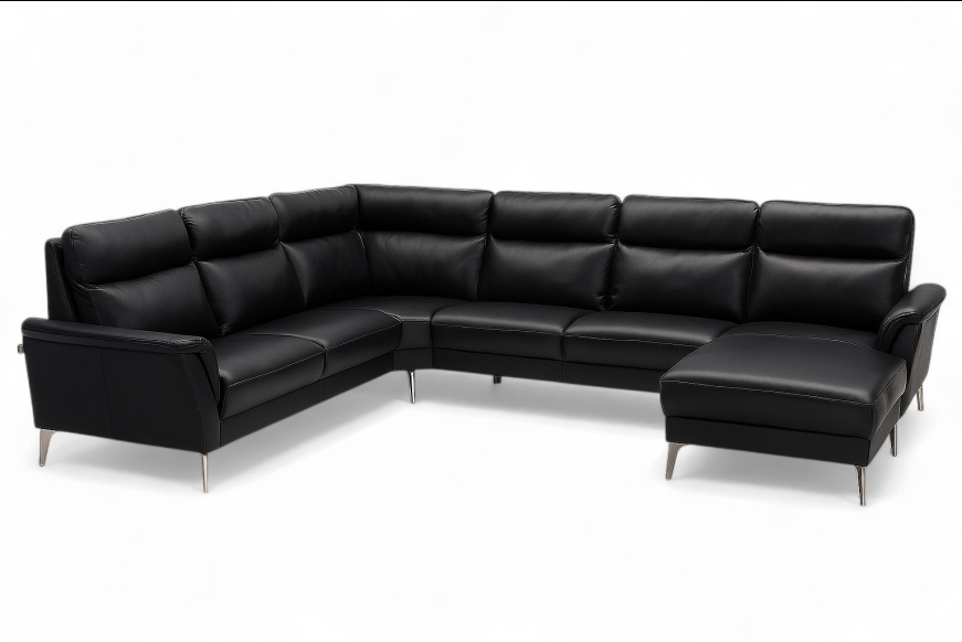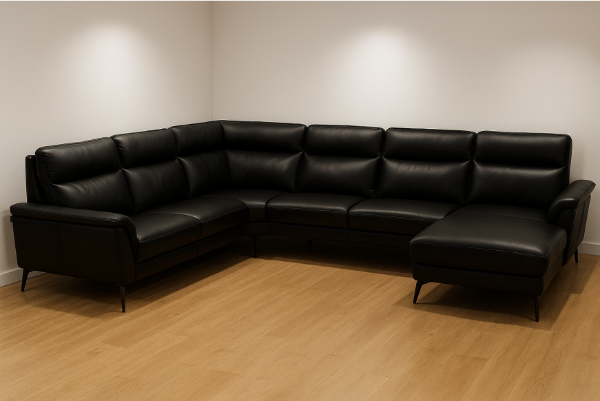Info: Komfortabel højrygget hjørnesofa i ægte okselæder (Soleda læder).Dess: Sort læder Soleda/skai