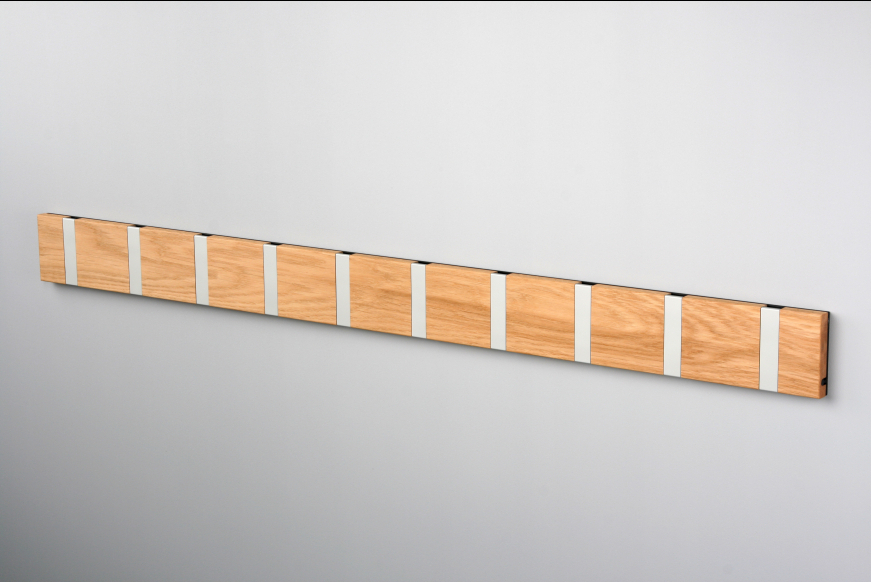 Elegant og robust knagerække med 10 knager. Vælg mellem flere trætyper og bredt udvalg af farver. Mål: L: 99,0 cm, H: 7,9 cm, D: 18 cm.