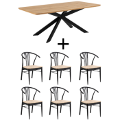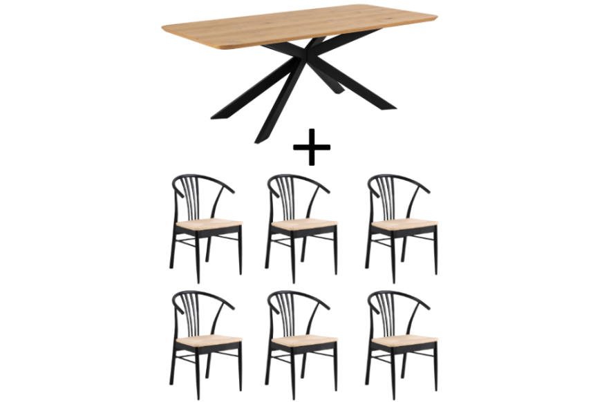 Elegant spisebord 100 x 200cm, med egefiner + 6 stole