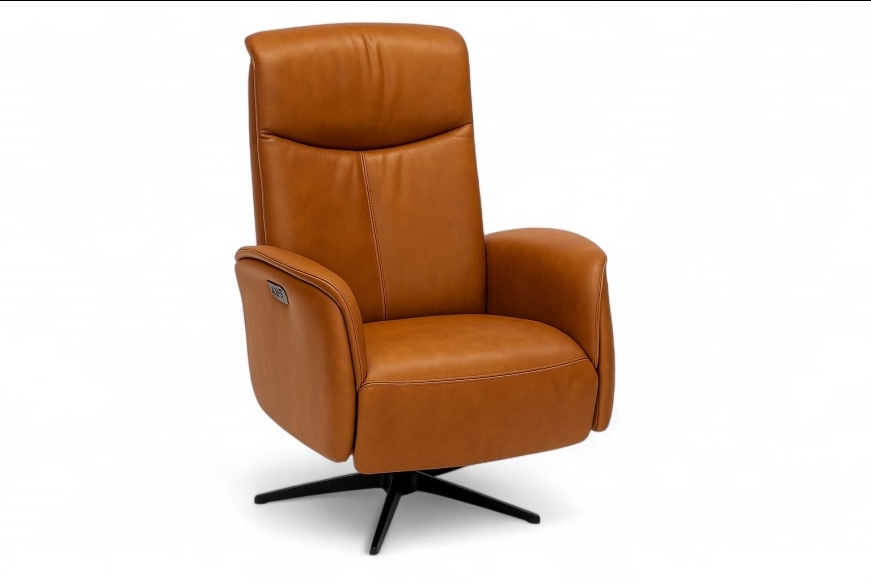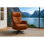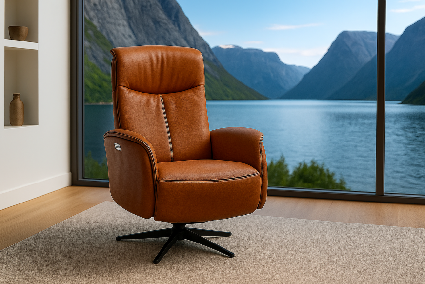 Fjord er en lænestol der forener luksus, design og komfort med semianilin læder, 3 motorer og moderne sort metalsokkel.