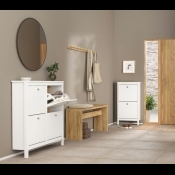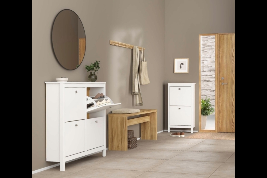 MADRID Er en serie af møbler fra danske Tvilum, med flere spændende produkter. Du finder kommoder, skoskab, natbord og skrivebord. . har 4 klapdøre, så man nemt kan holde styr på sine sko. Vi anbefaler ca. 16 par sko i denne model.