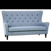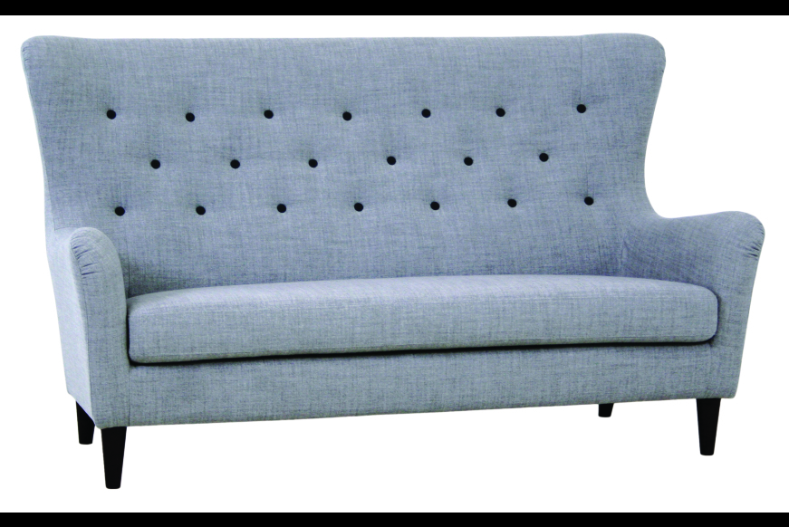 Flot retro sofa i grå stof med sorte knapper. Sofaen har sorte runde træben.
