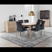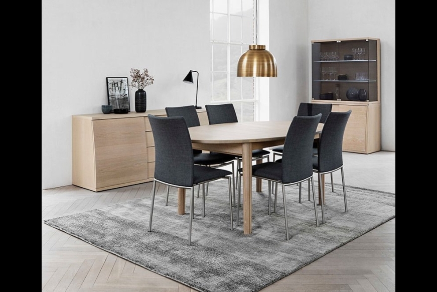 Det børstede stål på spisestuestolen giver en spændende kontrast-effekt til træmøblerne.