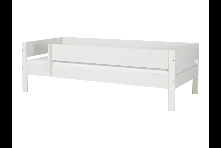 Hvid børneseng med sengehest.
