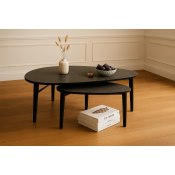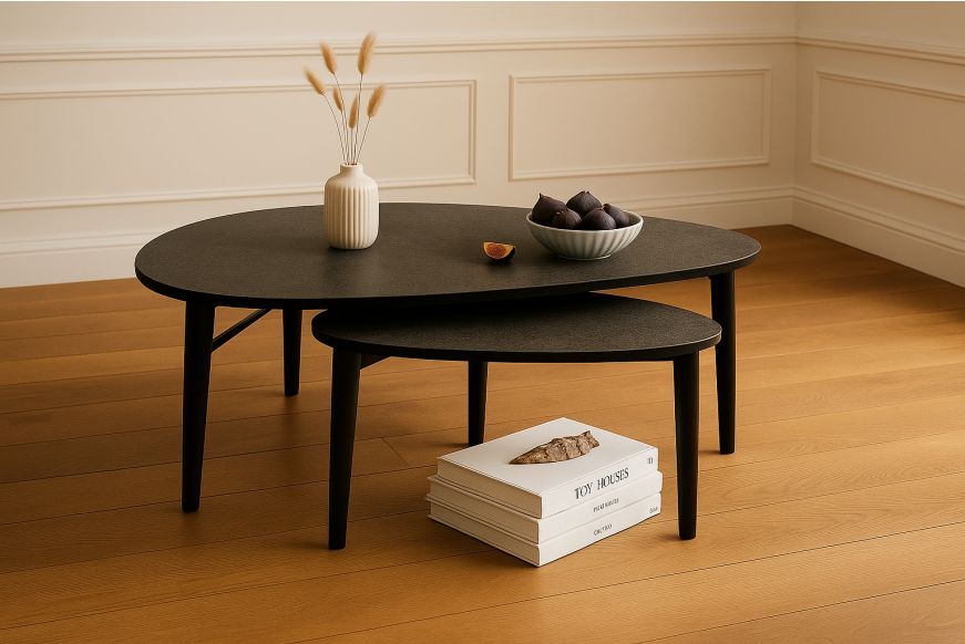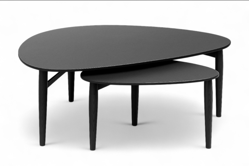 Design dit eget sofabord. Trekantede sofaborde 42 x 67 cm. / 89 x 126 cm. Mørk grå stenlook laminat med sorte træben. Sætpris:
