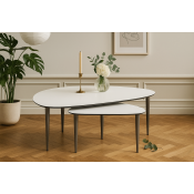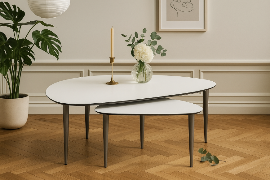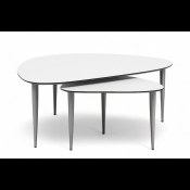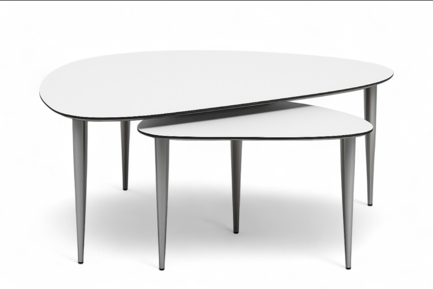 Design dit eget sofabord. Trekantede sofaborde 42 x 67 cm. / 89 x 126 cm. Hvid laminat med børstet stålben. Sætpris: