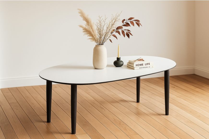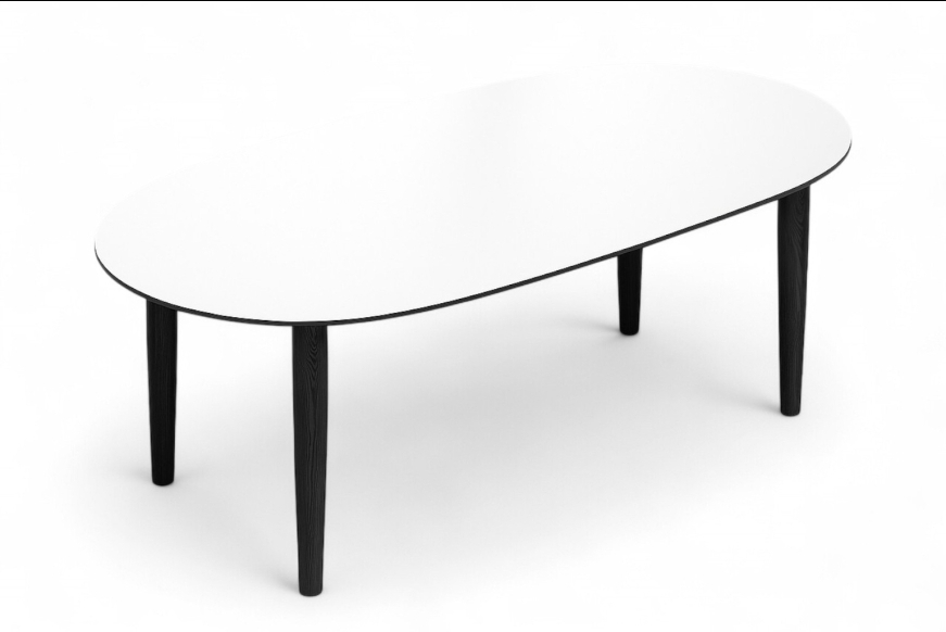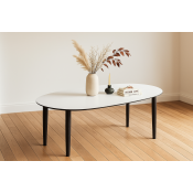 Design dit eget sofabord. Oval sofabord 68 x 128 cm. Hvid laminat med sorte træben.