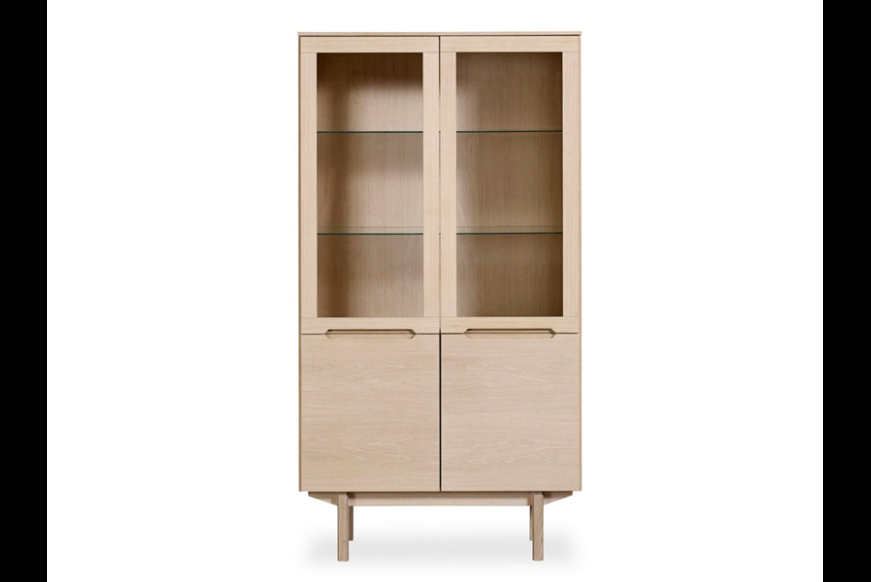 SM 307 vitrineskabet har et let og klassisk udtryk med fine detaljer. Vitrineskabet indeholder 2 glashylder samt en træhylde bag to døre. Hylden bag trædørene er bred og er perfekt til opbevaring af fade, tallerkner og andet spisestel. Vitrineskabet passer til SM306, som har samme lette design.