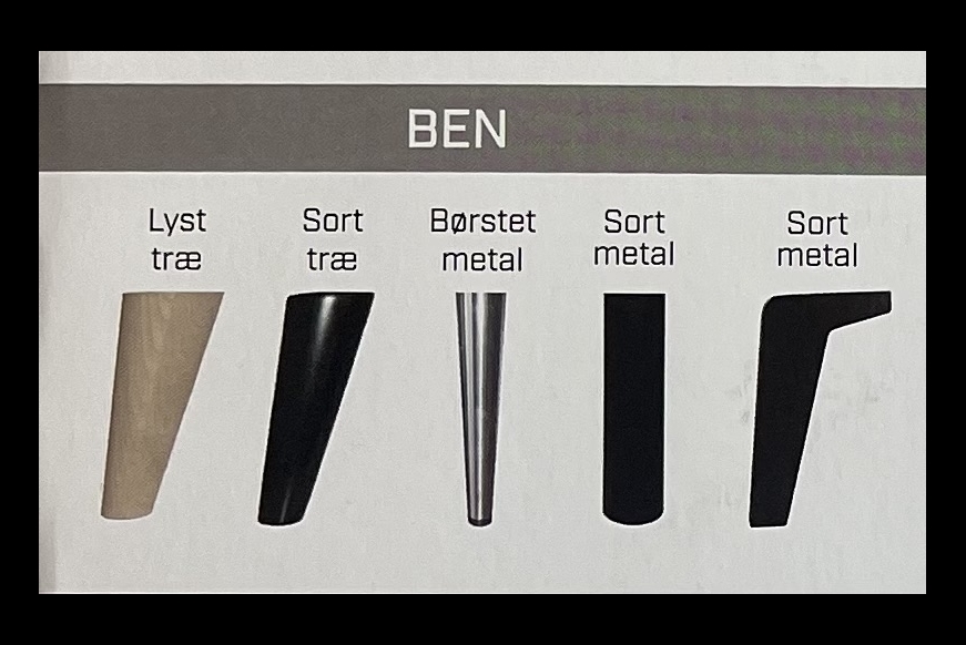 Ben kan der vælges imellem: egeben, sorte træben, børstet metalben, eller sorte metalben, vælg under variant.