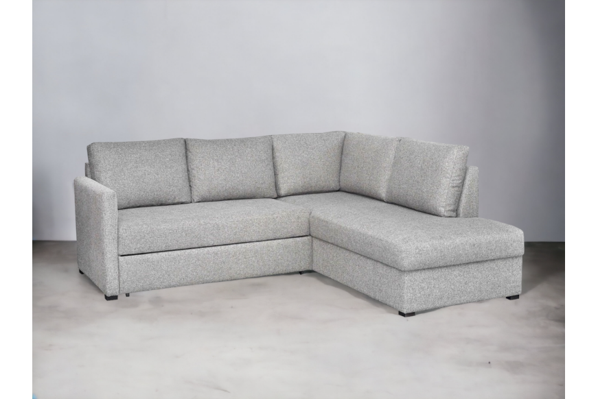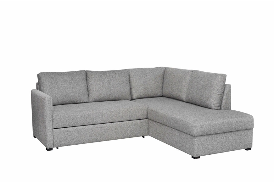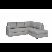 Komfortabel og smart højrevendt openend sovesofa, med simpelt udtræksystem polstret med polyether skum og kraftig skum i sæde og udtræk, og skum/silikone granulat i ryg puderne. Med indbygget magasin i open end delen. Med opbevaring i magasin.