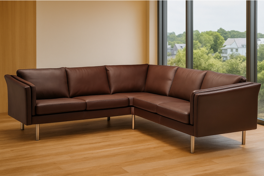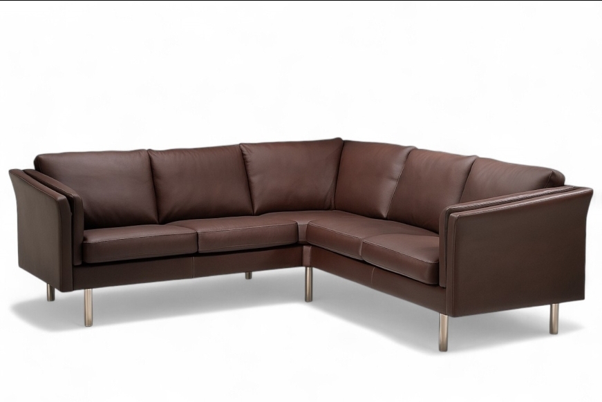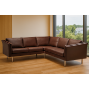 Klassisk dansk produceret hjørne sofa monteret med en kraftig læder 668. Koldskum i sædehynder og polydun i ryghynder.Dansk produceret. Fås i flere varianter læder, stof eller lækkert uldfilt i flere farver. Sofaen kan fås med enten bøg, eg eller metal ben.