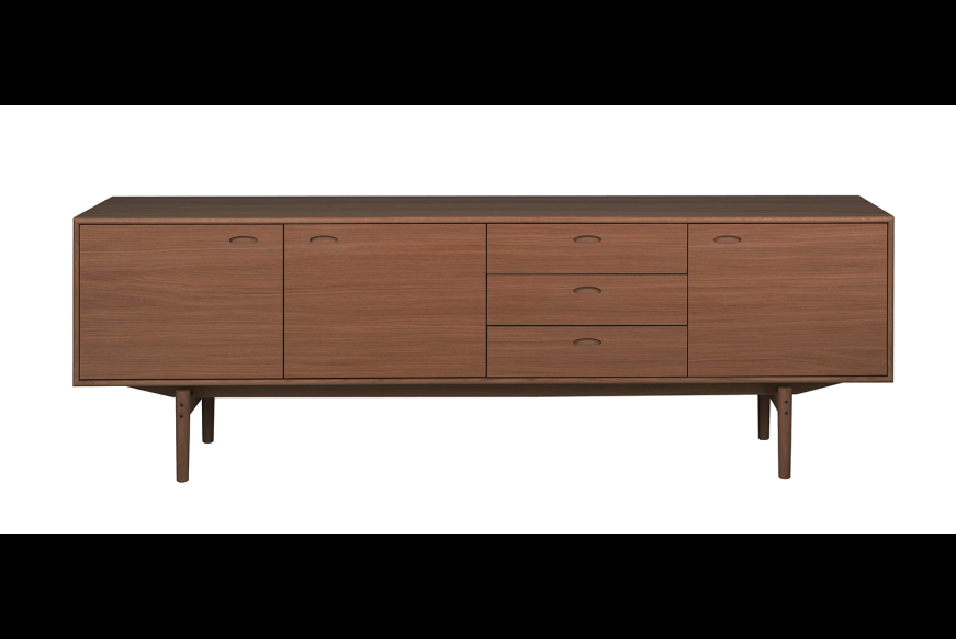 Flot skænk med 3 låger samt 3 skuffer. Kabinettet har elegant geringssamling på hjørner, afrundet forkant samt koniske massive træben. Alle ben har justerbare stillesko.