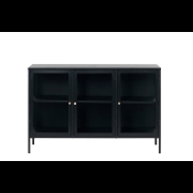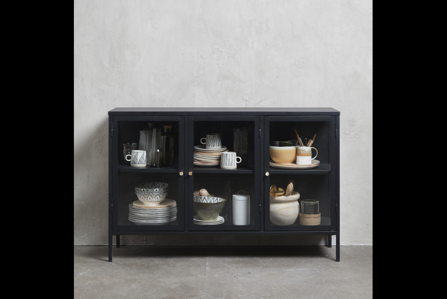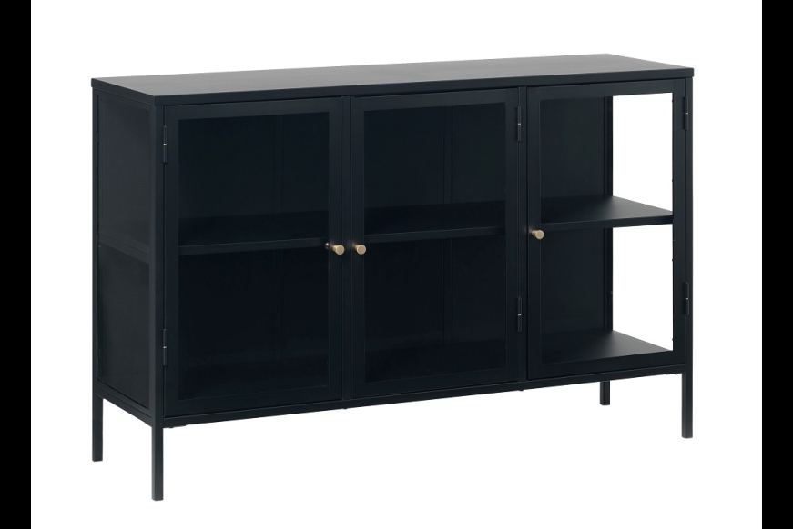Flot skænk i 3 sektioner med sort metal og glas i front og siderne.