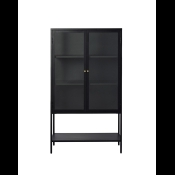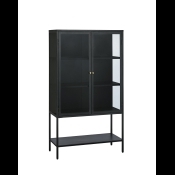 Flot vitrineskab i 2 sektioner med sort metal og glas i front og siderne.