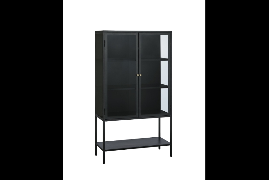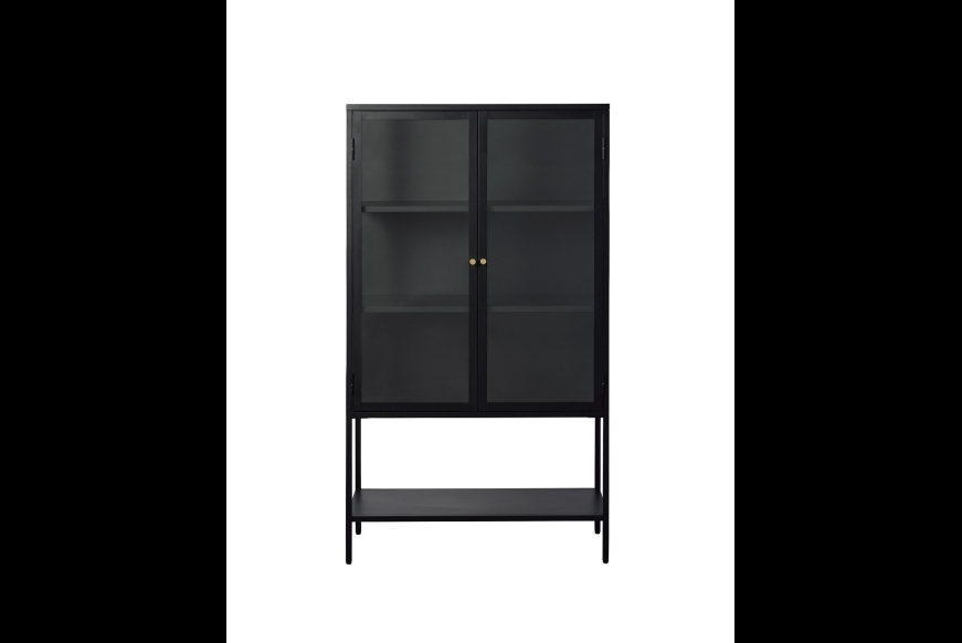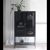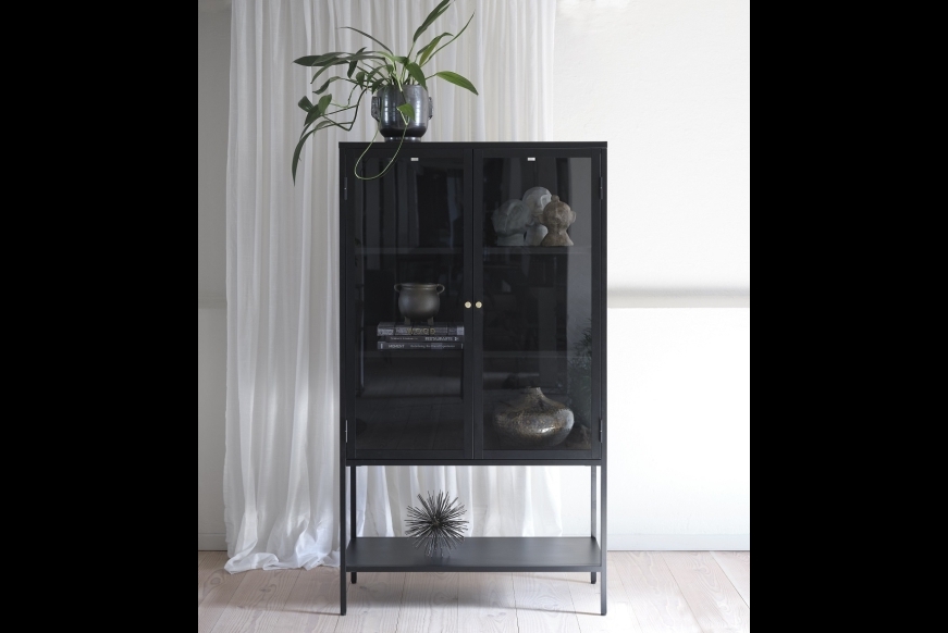 Flot vitrineskab med sort metal og glas i front og siderne.
