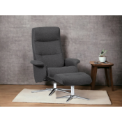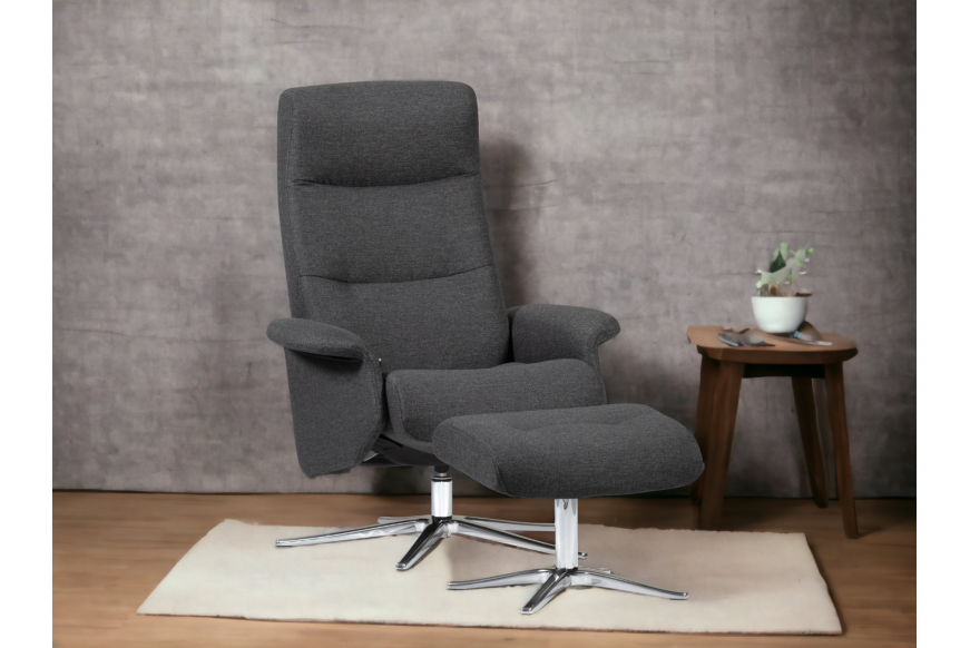 Drejestol og skammel. Kraftig stof. Fås også i læder.