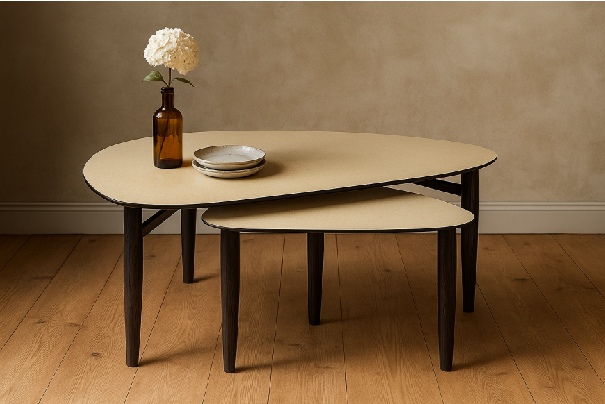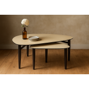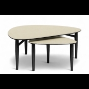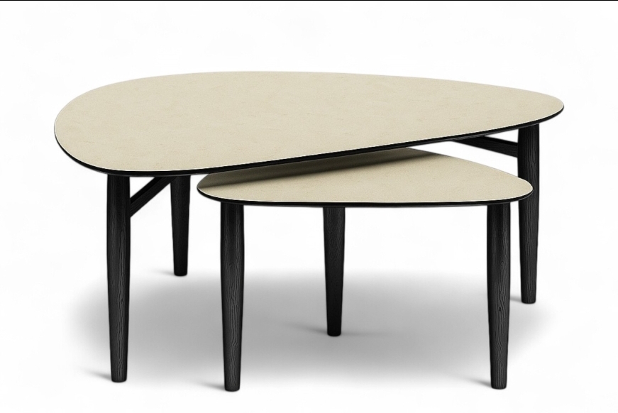 Design dit eget sofabord. Trekantede sofaborde 42 x 67 cm. / 89 x 126 cm. Beige stenlook laminat med sorte træben. Sætpris: